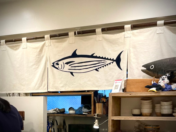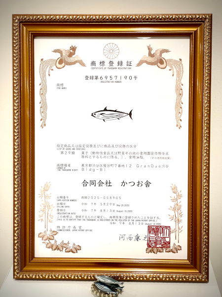 嬉しいことに、店内には、当所で出願代理し登録に至った商標(登録第6957190号)の登録証が飾られていました。この商標のかつおのイラストは、永松さんがこの仕事・お店を始めるきっかけをくれた御祖母様の作だそうです。「お店のアイデンティティーを象徴する大切なイラストなので、ぜひ商標登録したい」と出願のご依頼をいただいた際の言葉を思い出しました。永松さんの思いが込められたこのイラストはお店の看板・象徴として、これからもお店を支え続けてくれることでしょう。